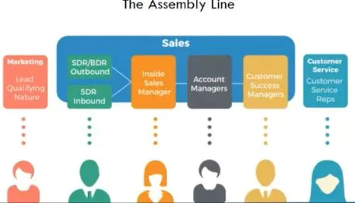 Le modèle le plus représenté aujourd’hui est l’Assembly Line. Ce modèle permet de spécialiser les équipes commerciales en fonction du parcours client. Nous avons donc l’équipe marketing qui accompagne des Inside Sales sur les leads entrants. Les SDR vont gérer les leads entrants, les BDR la partie chasse (outbound), les Account Executive se concentrent sur les démos, etc.